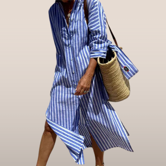 تتميز هذه الفستان القميص المخطط بقصته الواسعة والسلسة. تصميمه المزود بأزرار وأكمامه الطويلة يمنحان مظهراً غير رسمي وأنيق. مثالي للأيام المشمسة.