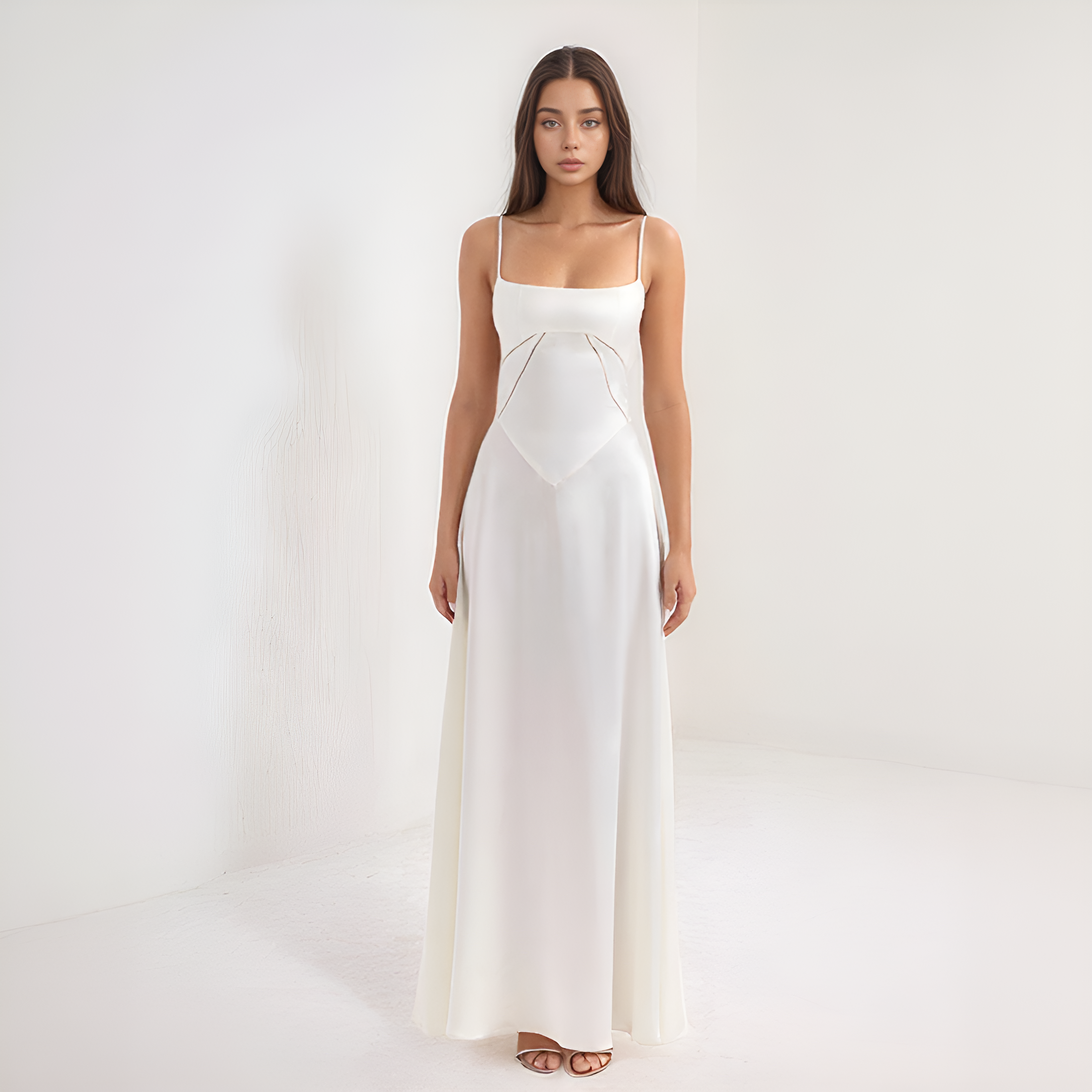 This long dress enhances the silhouette with its corset-style bodice that delicately highlights the waist. Its fluid cut adds movement and grace, while the corseted back adds a romantic and structured touch. Ideal for evenings, galas, or ceremonies.