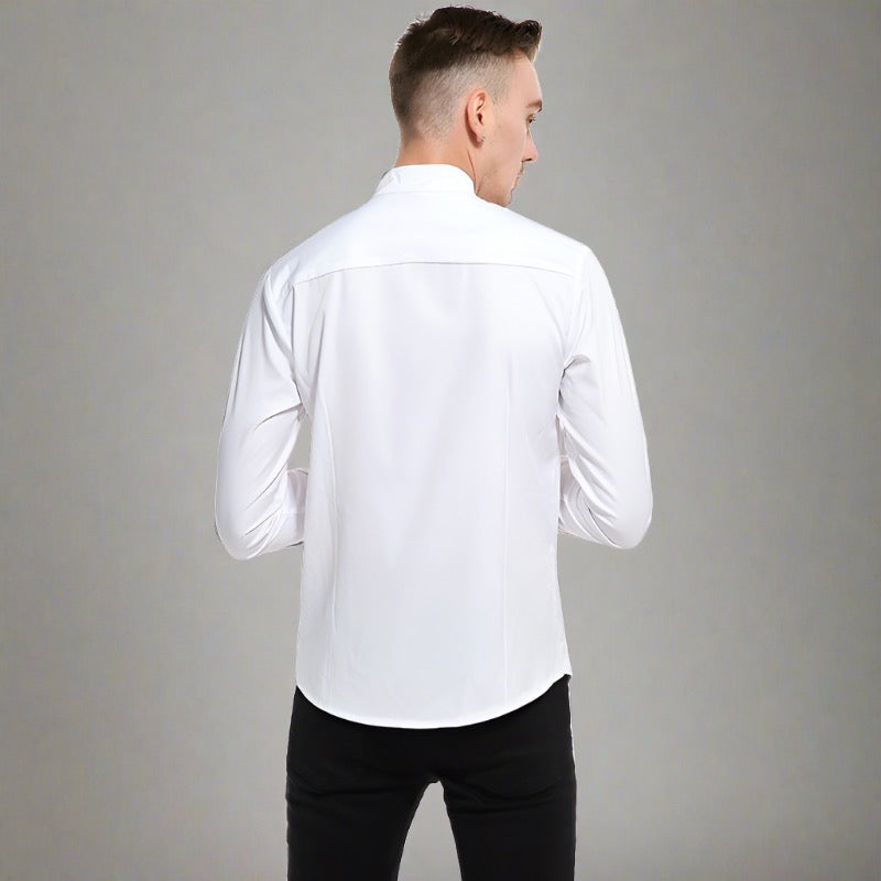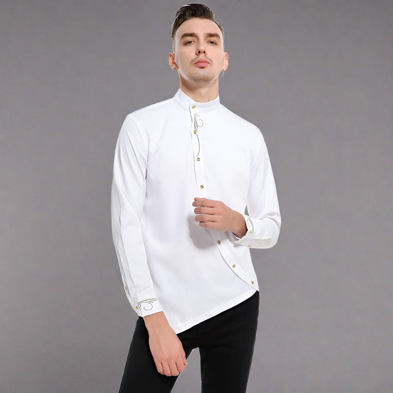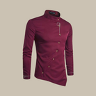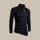 Tato košile s dlouhými rukávy má charakteristické diagonální zapínání na knoflíky. Její klasický střih zajišťuje pohodlné a elegantní nošení. Ideální pro formální i neformální příležitosti.