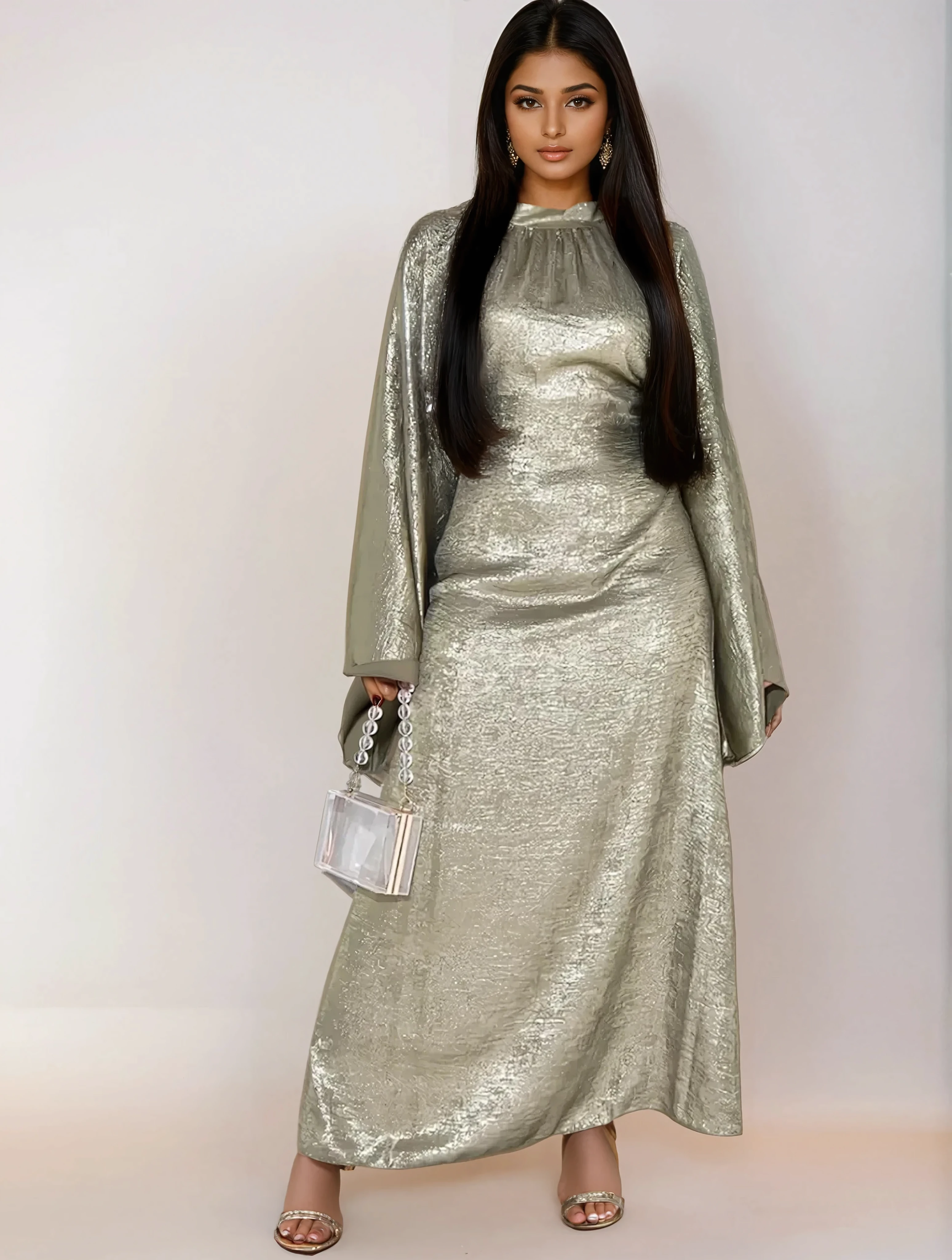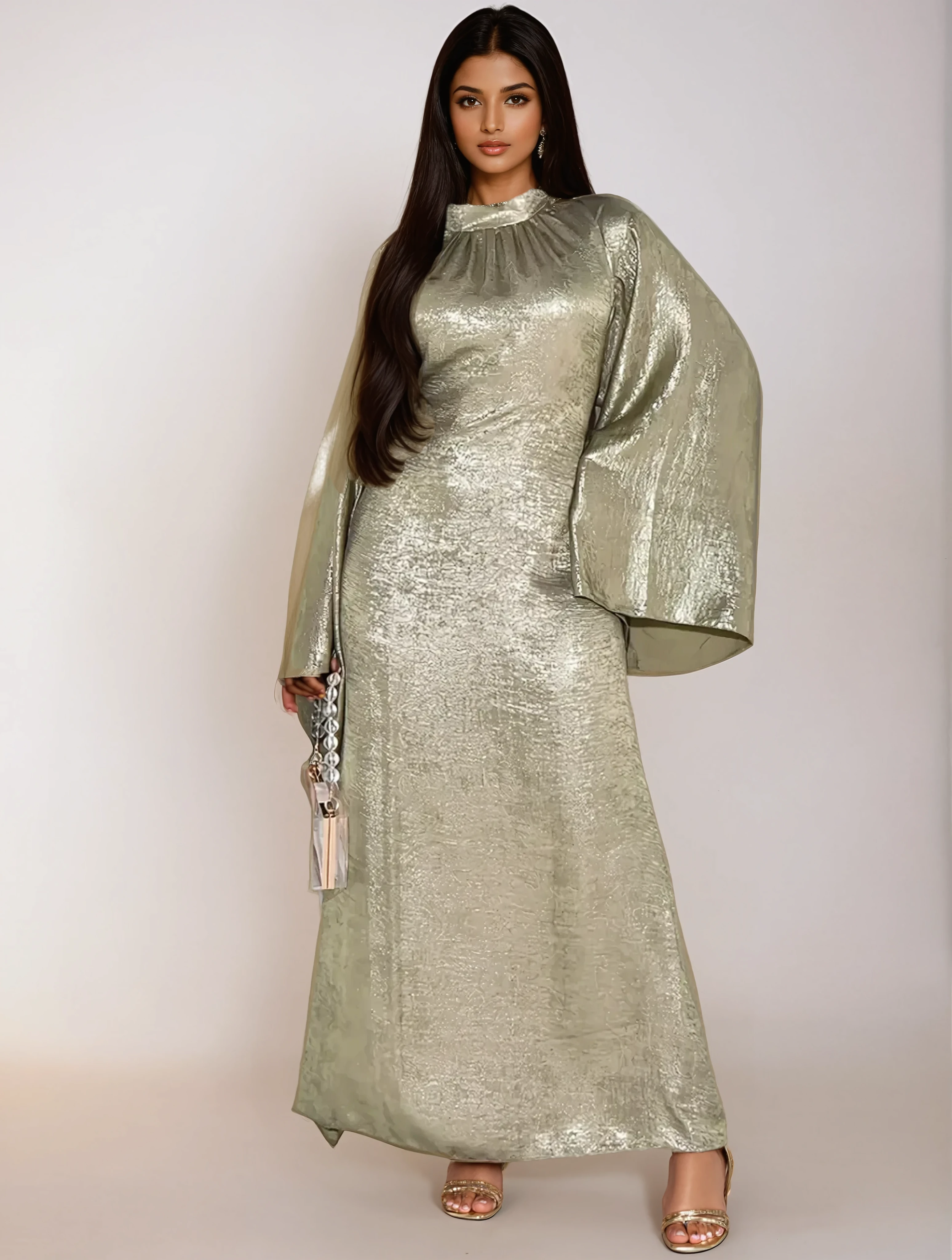 Předveďte se s grácií v této světle zelené abaya, která je jak vzdušná, tak moderní. Její dlouhý střih, neprůhledný materiál a jemná barva z ní činí ideální volbu pro vaše speciální události, recepce nebo formální večery.