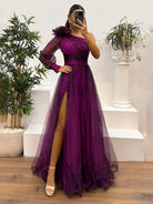 Adeline | Lange Kleid mit bedrucktem Tüll und Schlitz – Eleganz und Raffinesse