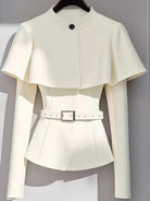 Diese taillierte Umhangjacke betont die Silhouette mit einem schicken und modernen Look. Ihr strukturierter Schnitt und der verstellbare Gürtel heben die Taille elegant hervor. Ideal für kühle Tage, verleiht sie jedem Outfit einen Hauch von Raffinesse.