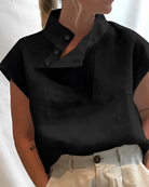 Αυτή η μπλούζα συνδυάζει έναν μοναδικό σχεδιασμό με εξαιρετική άνεση. Ο ψηλός, κουμπωτός γιακάς προσθέτει μια κομψή πινελιά στην εμφάνισή σας. Ιδανική τόσο για μια έξοδο στην πόλη όσο και για ένα απλό δείπνο.