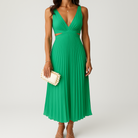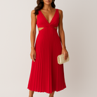 Αυτή η κομψή πλισσέ ρόμπα έχει μια εφαρμοστή γραμμή στη μέση και μια φούστα που ανοίγει, η οποία αναδεικνύει τη σιλουέτα. Η V λαιμόκοψη προσθέτει μια νότα εκλεπτυσμένου στυλ και κομψότητας. Ιδανική για βραδιές ή ειδικές περιστάσεις.