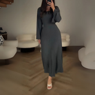 השמלה הארוכה עם השרוולים הארוכים מציעה סילואט נשי ומחמיא. זמינה במגוון צבעים, היא מתאימה לכל האירועים. העיצוב הנצחי שלה מבטיח אלגנטיות ללא מאמץ.