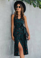 שִׁמְלָה אֲרֻכָּה בּוֹהֵמִי כהה זו מציעה סילואט זורם ורגוע. הדוגמה של הכתם הנמרי השחור וורוד מוסיפה נופך של ייחודיות.