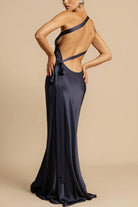 השמלה הארוכה עם רצועה אחת מציעה דמות זורמת ואלגנטית. העיצוב האסימטרי מדגיש את הדמות בנעימות. מושלמת לערבים ואירועים מיוחדים.