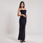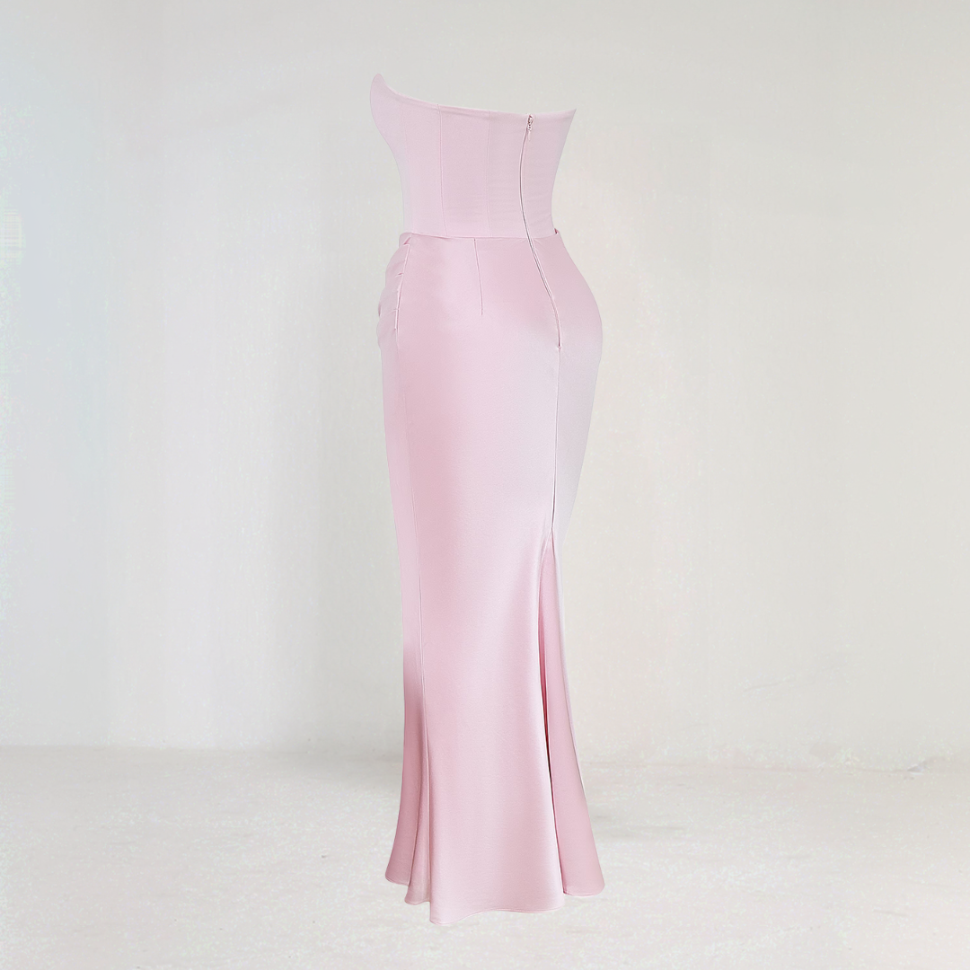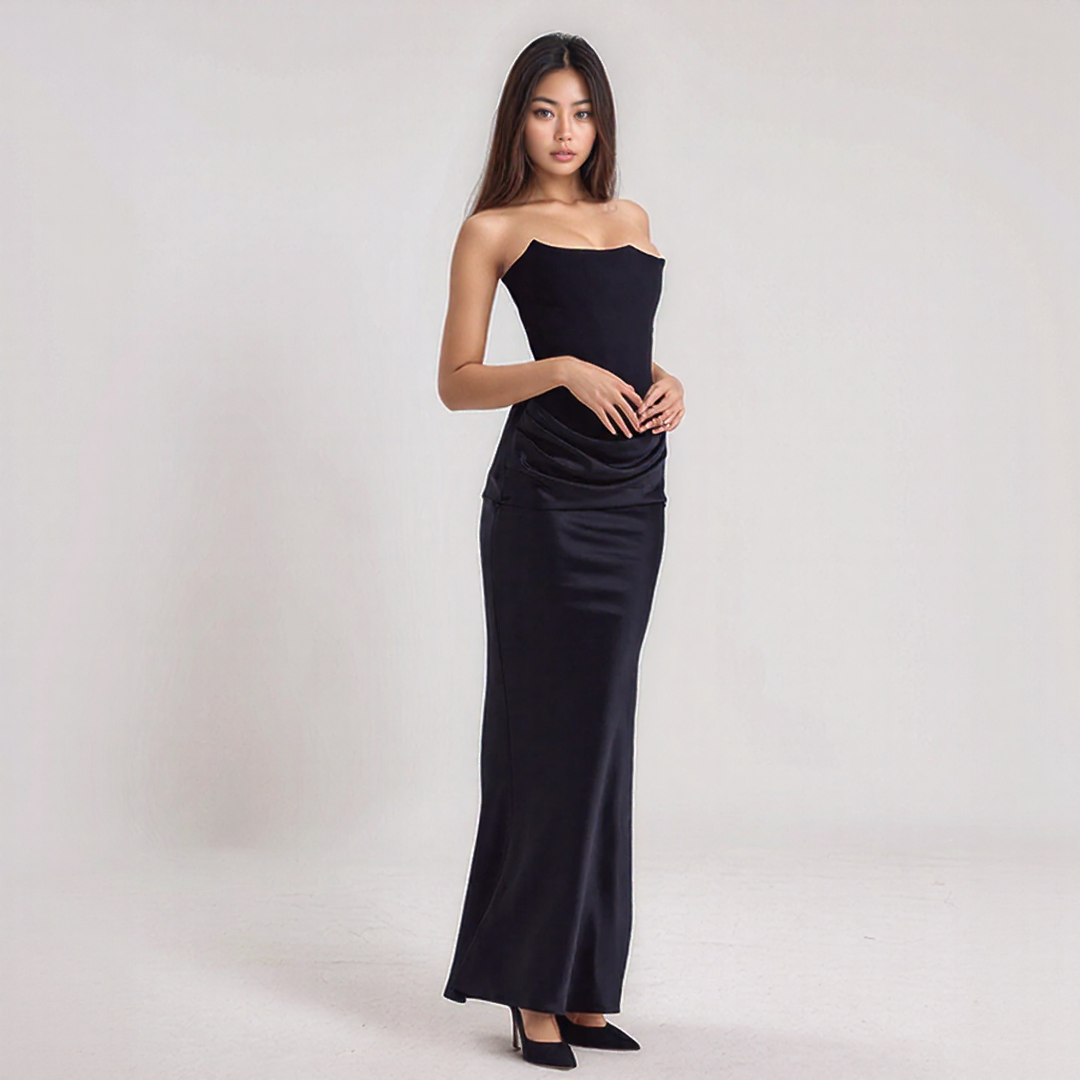 Questo abito corsetto elegante valorizza la silhouette grazie al suo top strutturato. Il suo design senza spalline e la sua linea fluida conferiscono un tocco di sofisticatezza naturale. Ideale per serate eleganti e occasioni formali.