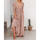 この流れるようなロングドレスは、エレガントでリラックスしたシルエットを提供します。深いVネックがシルエットを引き立てます。晴れた日や夏の夜にぴったりです。