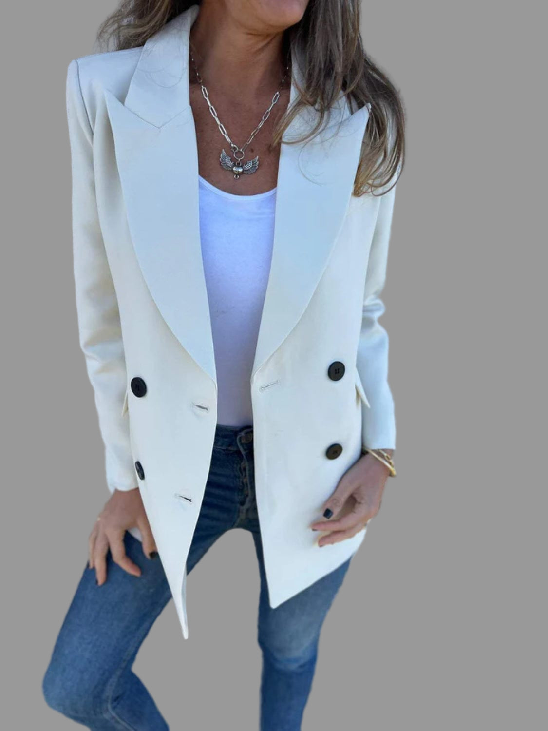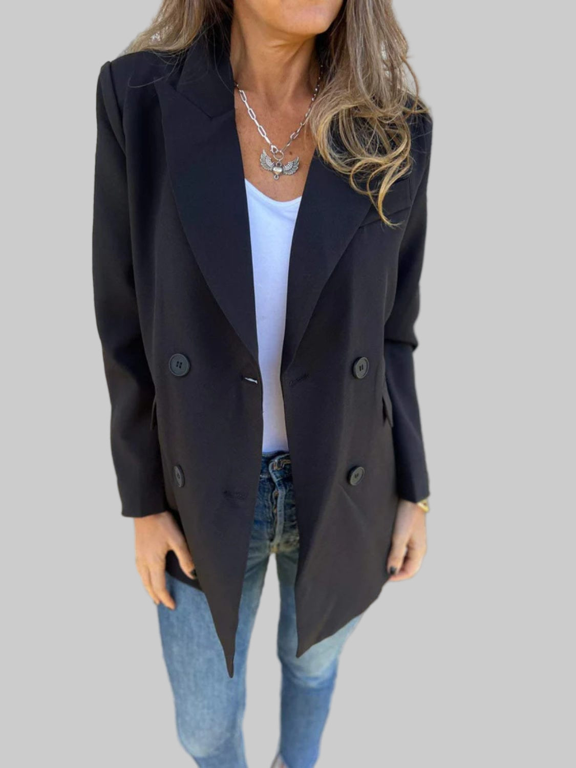 このダブルブレストの女性用ブレザーは、確固たるエレガンスと自然な自信を体現しています。その構築的なカットはシルエットを引き立てながら、現代的で洗練された印象を与えます。オフィスでも外出時でも完璧で、どんな服装にも瞬時にシックなタッチを加えます。