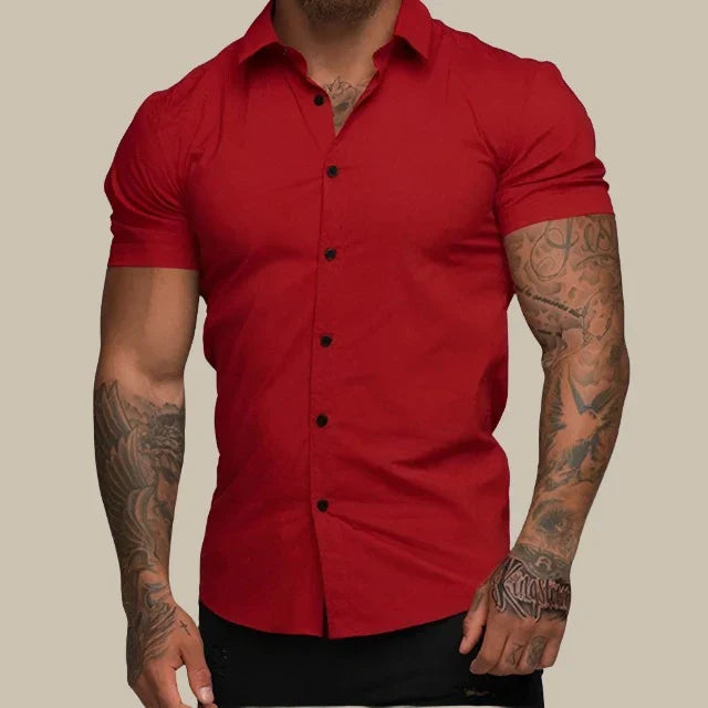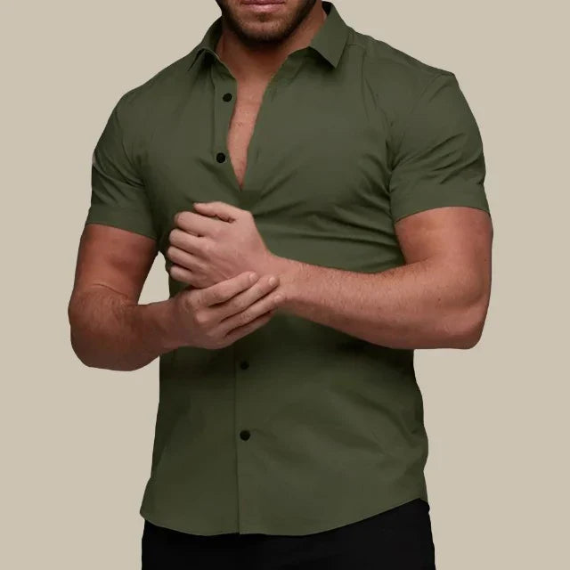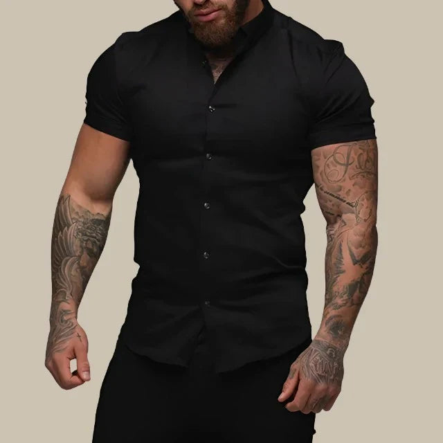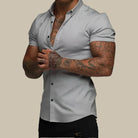 このタイトフィットのシャツは、現代的なエレガンスと快適さを兼ね備えています。プレミアムストレッチ素材で作られており、柔軟性と洗練された印象を提供します。ショートスリーブはエレガントでカジュアルなシルエットを演出し、暑い日には最適です。