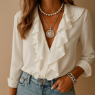 このブラウスは繊細なフリルと長袖を持ち、女性らしい印象を与えます。流れるようなカットは、1日中快適さを保証します。すべてのコーディネートに合わせるために、複数の色で利用可能です。