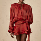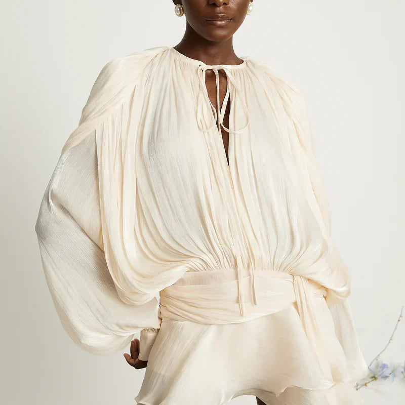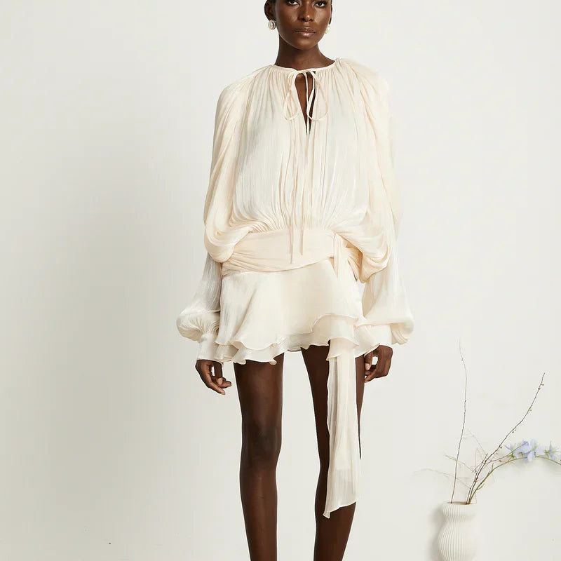 このミニドレスは、リラックスしたカットと流れるような袖を組み合わせた、快適で洗練されたスタイルを実現しています。その多用途なデザインはさまざまなシーンに適応し、魅力的なシルエットを提供します。首元の繊細なリンクが、さらに女性らしさを加えています。