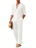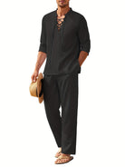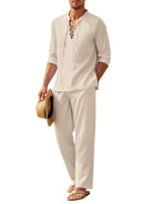 このボヘミアンシックなセットは、首元にレースアップが施された長袖トップスと、ゆったりとしたシルエットの流れるパンツで構成されています。晴れた日やカジュアルな外出に最適で、スタイルと快適さを兼ね備えています。軽やかなシルエット、実用的なポケット、調整可能なウエストは、見た目だけでなく機能性も兼ね備えた選択肢です。