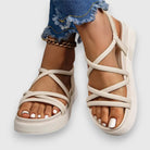 このフラットサンダルは、軽さとサポートの完璧なバランスを提供します。伸縮性のあるストラップが簡単なフィット感を保証し、交差したバンドがあなたの服装にエレガントなタッチを加えます。散歩、夏の外出、またはリラックスした日々に最適です。