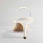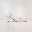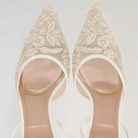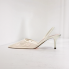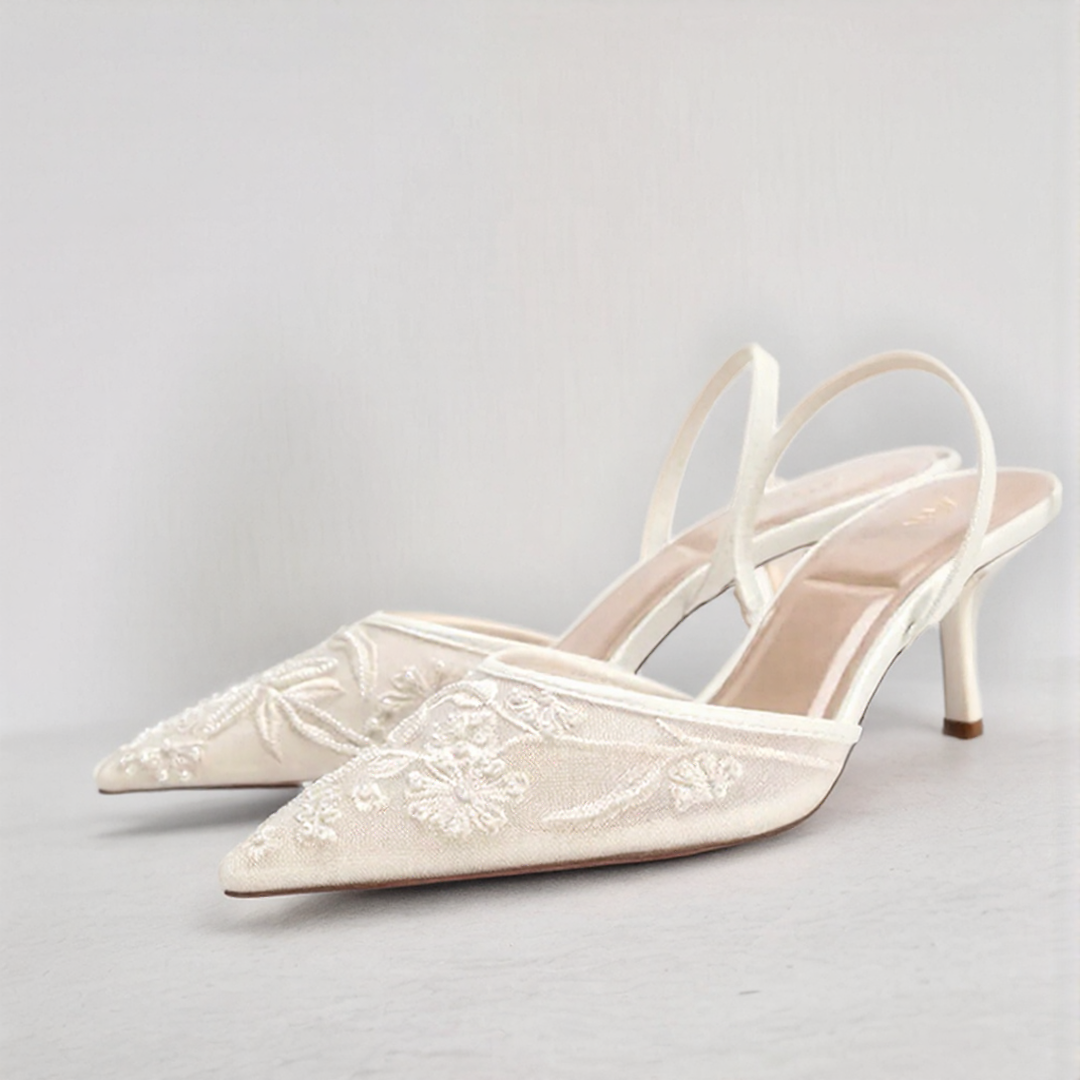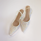 Te buty na obcasie wyróżniają się delikatnym haftem kwiatowym na mocnej, lekkiej i przezroczystej cholewce. Ich spiczasty czubek wydłuża sylwetkę z elegancją, podczas gdy regulowany pasek zapewnia pewne trzymanie, dodając jednocześnie nuty wyrafinowania.